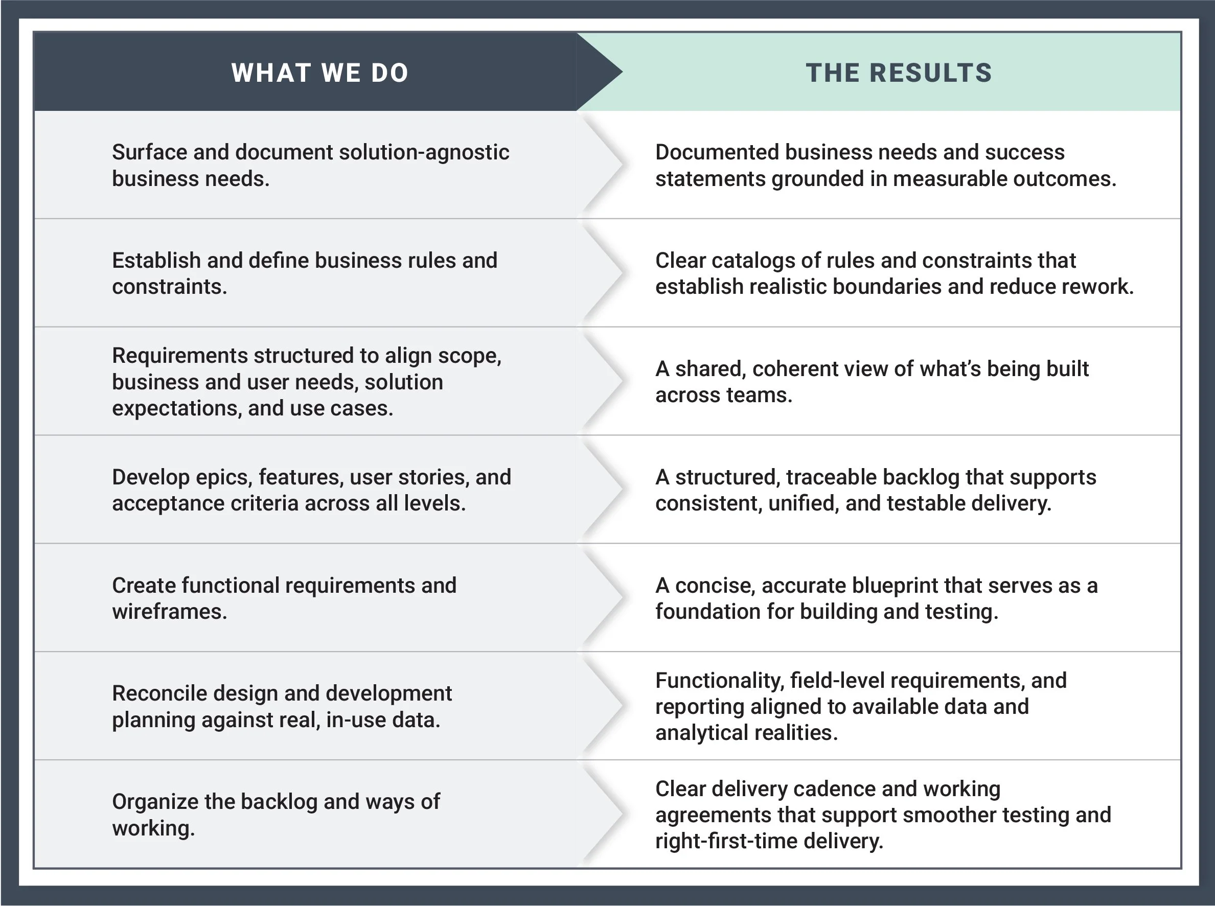 Give your technology team clear guardrails, reduce rework, and accelerate delivery by defining system-level success and translating it into structured requirements—including epics, features, user stories, and fit–gap analysis.