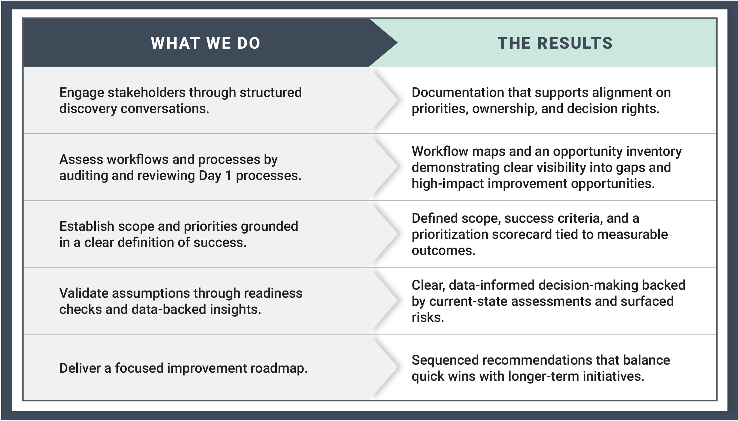 Discover opportunities for improvement through structured conversations, workflow mapping, and readiness assessments that support immediate gains and long-term growth.