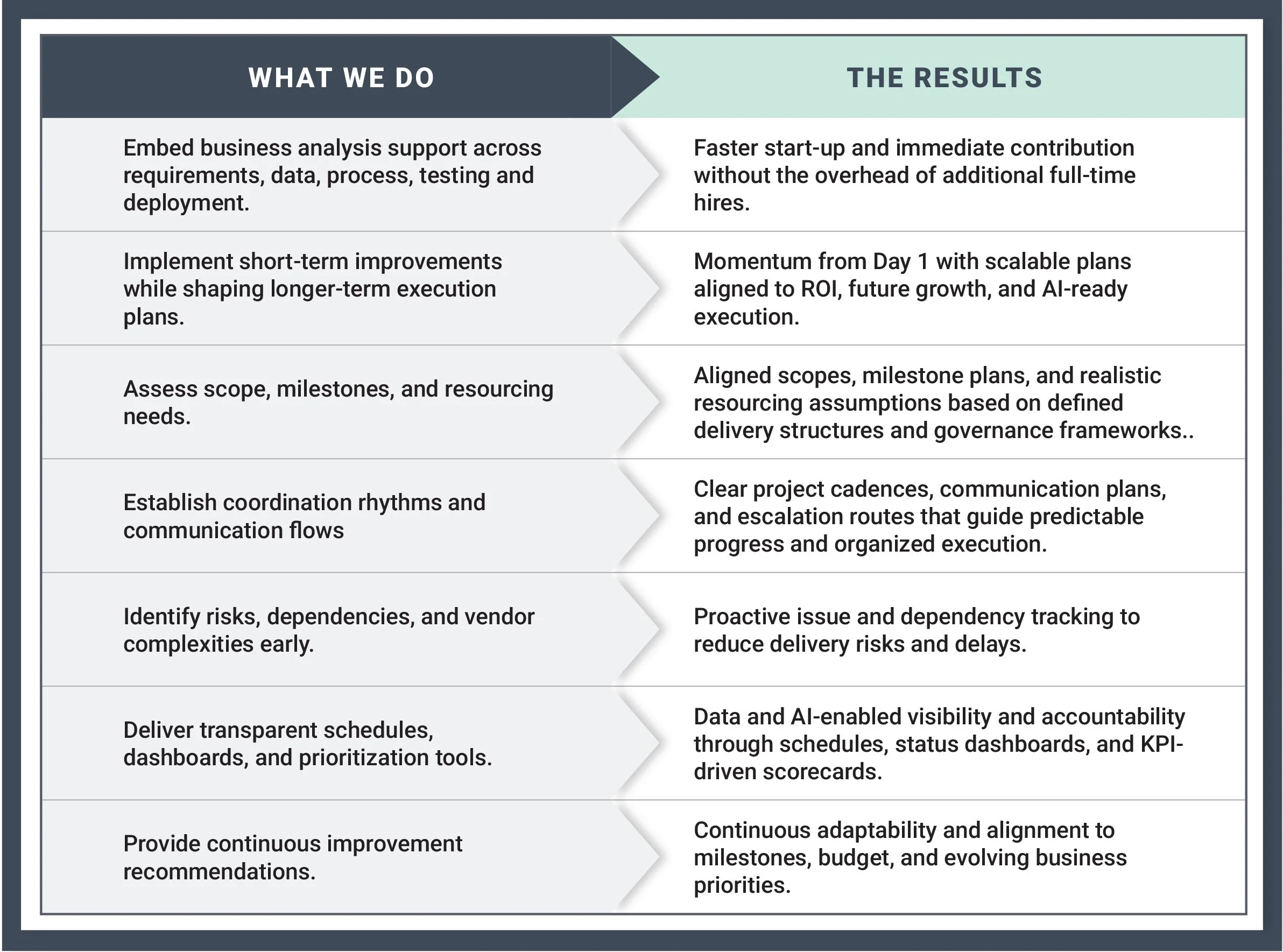 We translate complexity into action through initiative scoping, KPI development, and project roadmaps that connect short-term wins to long-term outcomes.